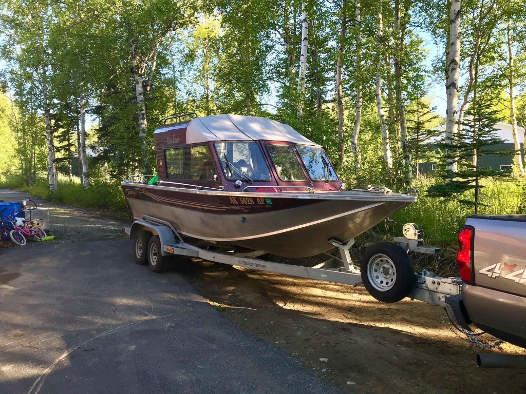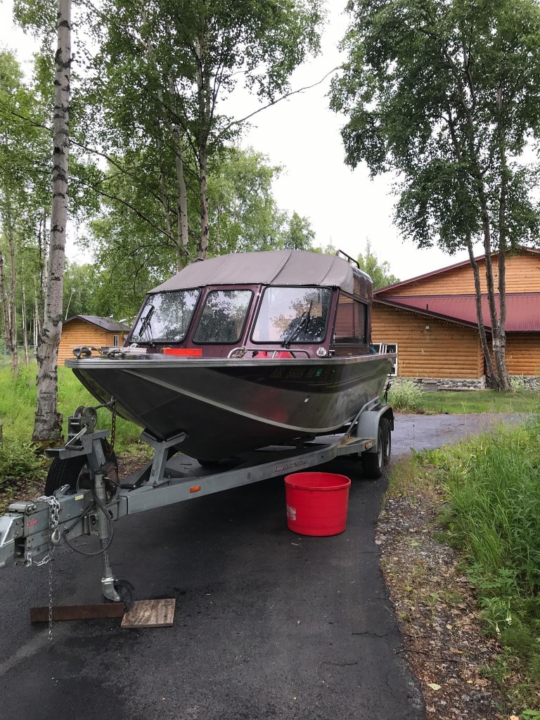 Mini mission scrubbed for today at 730pm. Started out great, everybody up and dressed, beer loaded, out of the driveway on time at 930. Quick stop at Carl’s and the grandkids and I agreed on everything from the mix and match menu. Had to drop off a couple bear hides at FedEx to send to the Indiana boys. Pulled out on the Parks Highway and our friends that were travelling with rolled up behind us with their boat in tow. Drove about 40 miles to the launch put both boats in the water. Friends boat started but came off the trailer hard with a lot of reverse. Our boat wouldn’t turn over. Found a loose cable on the starter tightened cracked plastic housing on the solenoid. Jumped solenoid with a screw driver started right up. I took truck and trailer up to the parking lot and walked back down to the launch. Friends boat won’t even turn over. Tried jumping battery posts were hot. He finally removed both wet exhaust manifolds so he could get the spark plugs out of the 351 Ford Redline marine engine. Engine had sucked water into cylinders and hydro locked. Turned it over a few times put it back together and it started. Ready to go. Got across the new sandbar at the mouth of the launch in good shape now headed down the Big Susitna Susitna River on the way to the cabin ready to play lumberjack and harvest some trees. 5 miles down river friends boat starts running rough. In a true act of MacGyverism (that’s a new word I coined explicitly for Stephens adventures) he took out the newly installed electronic ignition and reinstalled the points and condenser. All this anchored up in the strong current in the middle of the river. Underway again.