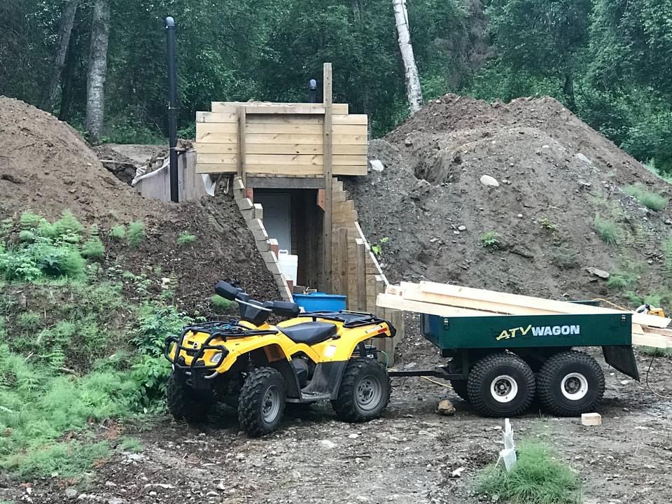 I spent most of Fri and all of Sat reinforcing the root cellar. Initial engineering was weak. Built a 8 x 8 x 16 foot box out of treated lumber in a hole dug out in the side of the hill. Waterproofed it, covered with foam board and then covered the whole thing with dirt that I dug from the Silty Slough Gold Mine. (That’s a whole different adventure that I can tell you about over a box of wine). Anyway I used 4 x 4s for the wall studs and over the winter they started to bow in and the roof started to sag a little bit.