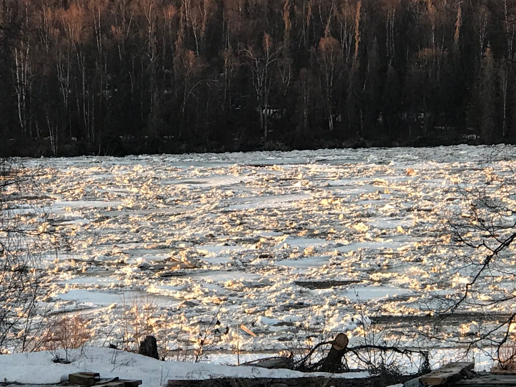 When I went outside this morning the river was still jammed with ice, nothing moving. Good, we didn’t miss the breakup. Shortly after noon I went out on the deck and the river was on the move. Grab the camera, get a FB post on Friends of the Yentna. This is exciting. Friends you have to understand who you are dealing with here. We have been sitting around watching snow melt for the past few weeks. We can now see something happening that isn’t in slow motion. FB post are alive..moving here…stopped there….river rising…river falling…the creek is running the opposite way. This breakup is way more important to us than the Bill and Melinda Gates breakup. This means we will be able to travel again, soon we can get to the post office, the mosquitoes and bears will be waking up, and we can once again begin to get ready for winter.