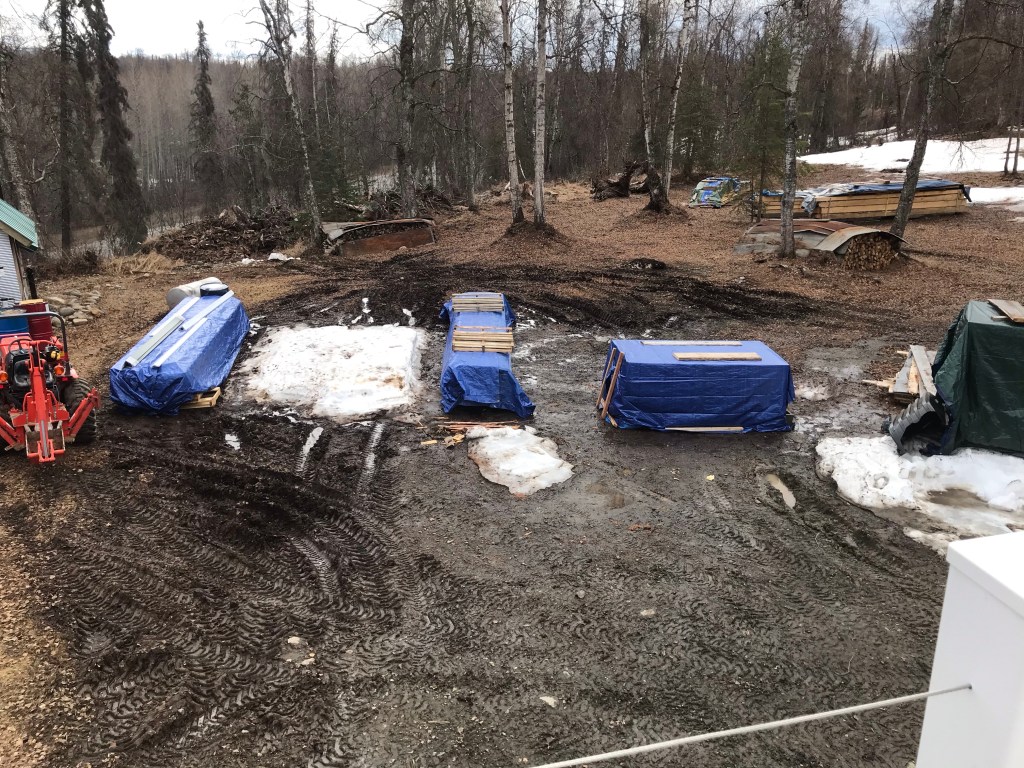The snow from the roof on the north side of the cabin is in a huge pile in the crawl space I dug last fall for the addition. It is not in direct sunlight so it will be July before it all melts. We need it out of there to drive the pilings in two weeks. I’ll try to get the Kubota down the ramp I dug to get the rig down into the hole to see how firm the ground is. Not too bad. The actual hole has a gravel bottom so it is easy to maneuver once I’m down there. I hauled a few bucket loads of snow up the ramp and dumped them over the bank. It’s a little squishy but not too bad. Next bucket I can’t get up the ramp. I dumped the snow where I picked it up and back bladed the ramp a couple times. Maybe if I back up the ramp. No work. Multiple attempts and I’m dead in the water or mud in this case. I’ll wait until tomorrow morning when it has frozen back up. That’s enough fun for today. I waded up the ramp sinking about halfway up my boots and finally made it out of there. I went into the cabin and Kari let me know I had mud on the legs of my bib overalls. I’m just glad I had boots and overalls on. Normally I would be in underwear and slippers except now mosquito season is starting so I need clothes to help defend myself. Welcome to another shitty day in paradise.