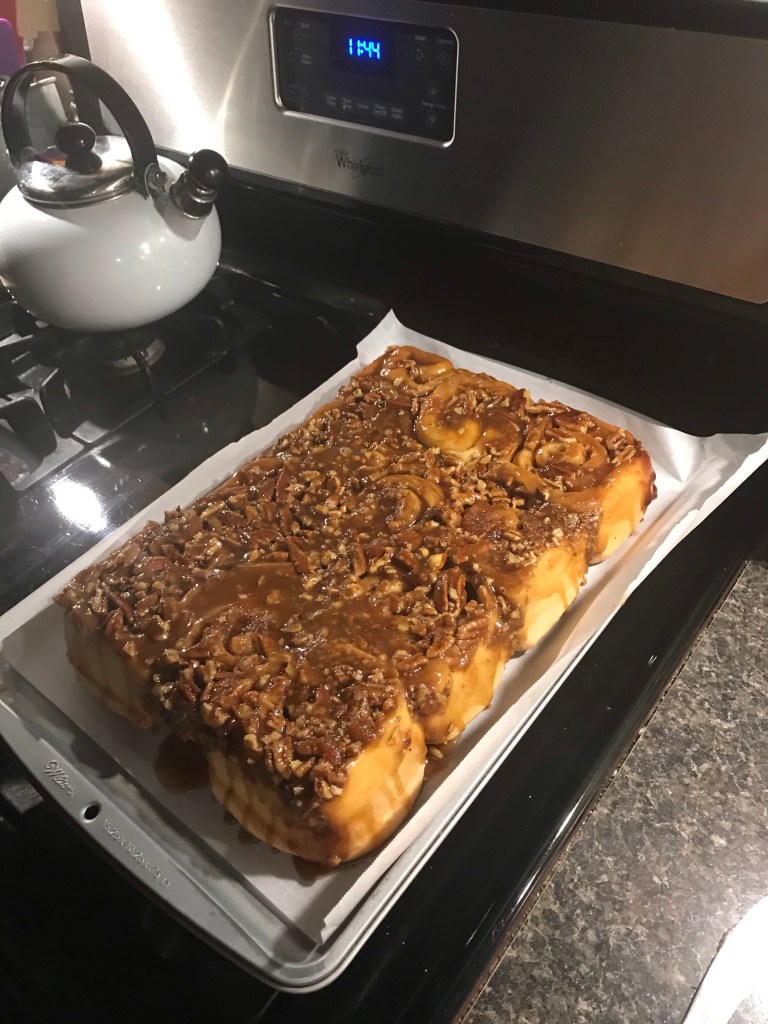 Kari decided to make pecan cinnamon rolls after supper. When they came out of the oven I had to take a picture. It was then I noticed the clock on the stove it was 11:44 pm. Enough fun for the day time for a nap. I did manage to stay awake past midnight to be the first to wish her a Happy Mother’s Day.