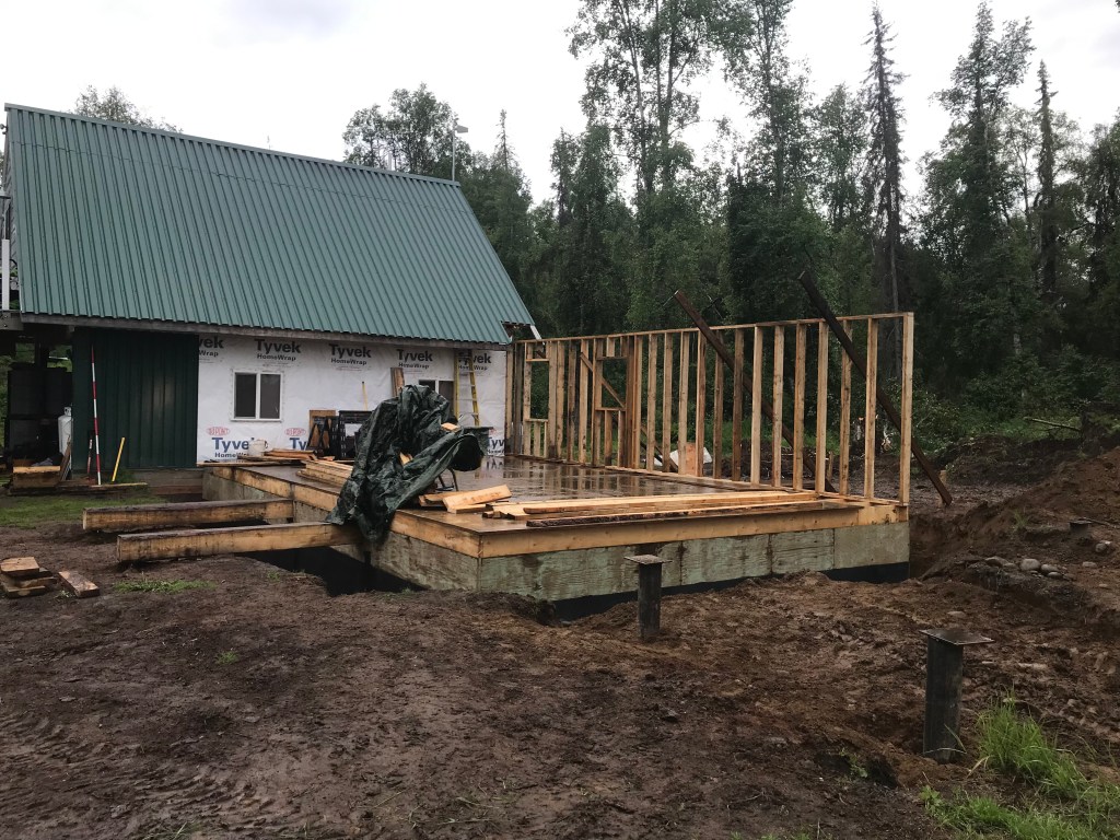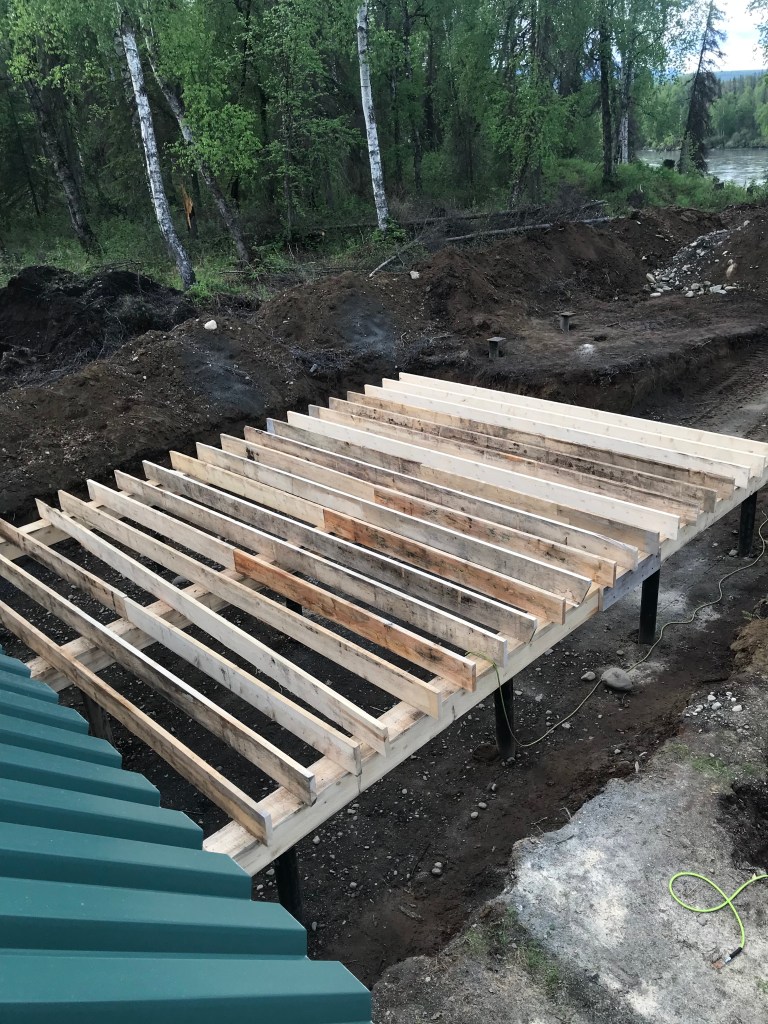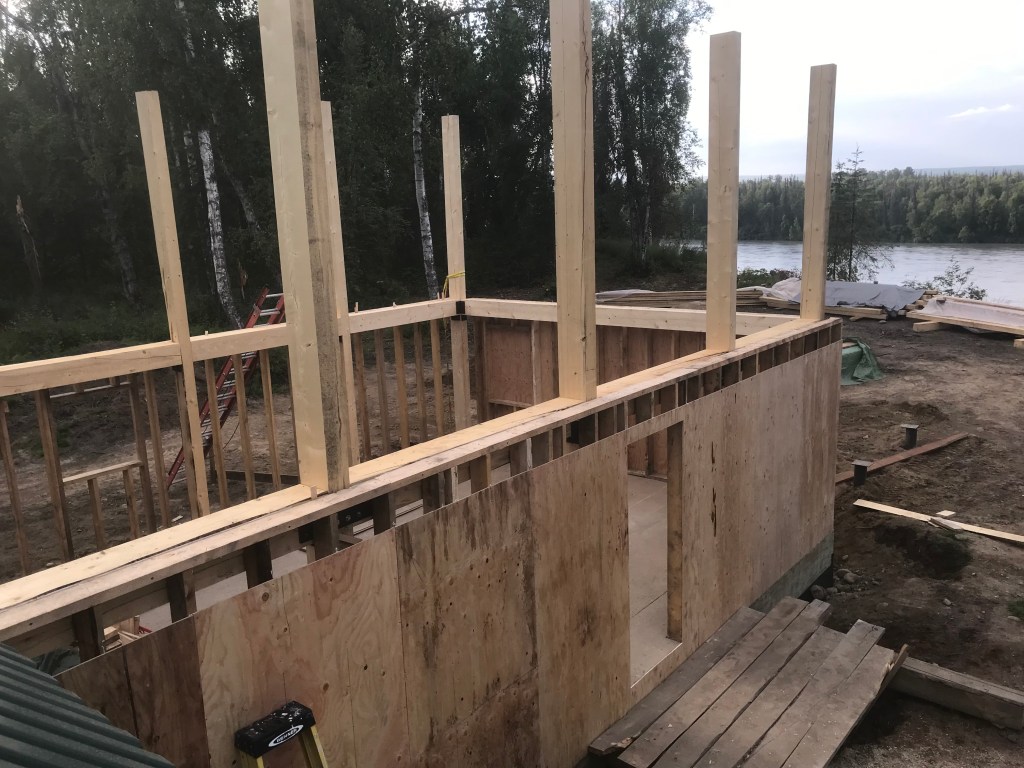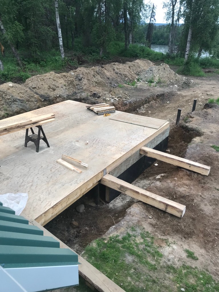 I think today was the day there were rumblings on the river telegraph aka FB that a barge is on the way upriver. I know you are thinking Mississippi River barges but our river barges are boats that are bigger than the Wine Down. Some are 30, 40 maybe even 50 feet long. They haul everything that is big and heavy that is needed up the river. Dozers, trucks, barrels of fuel, building packages for cabins, and in the case of the addition to Spruce Manor windows and a bathtub. As soon as our pilings are in and the river level cooperates a barge will haul the rig out. I tried to get the tractor out of the hole but I slept in too late and the mud was too soft. We need to get it out to do other things. The chief engineer said we need to lay boards down to get through the mud. I guess someone with a sawmill should have a lot of slabs laying around so that’s what we did. It walked right up the ramp. The chief engineer also cooks. Today she slow roasted a corned beef brisket glazed with mustard, honey, and brown sugar. We have boiled it before with cabbage and potatoes. Tonight’s dinner was awsome along with homemade potato salad and the bread she bakes in a big cast iron pan. If she keeps cooking like this I will need to redesign the addition with wider doors.