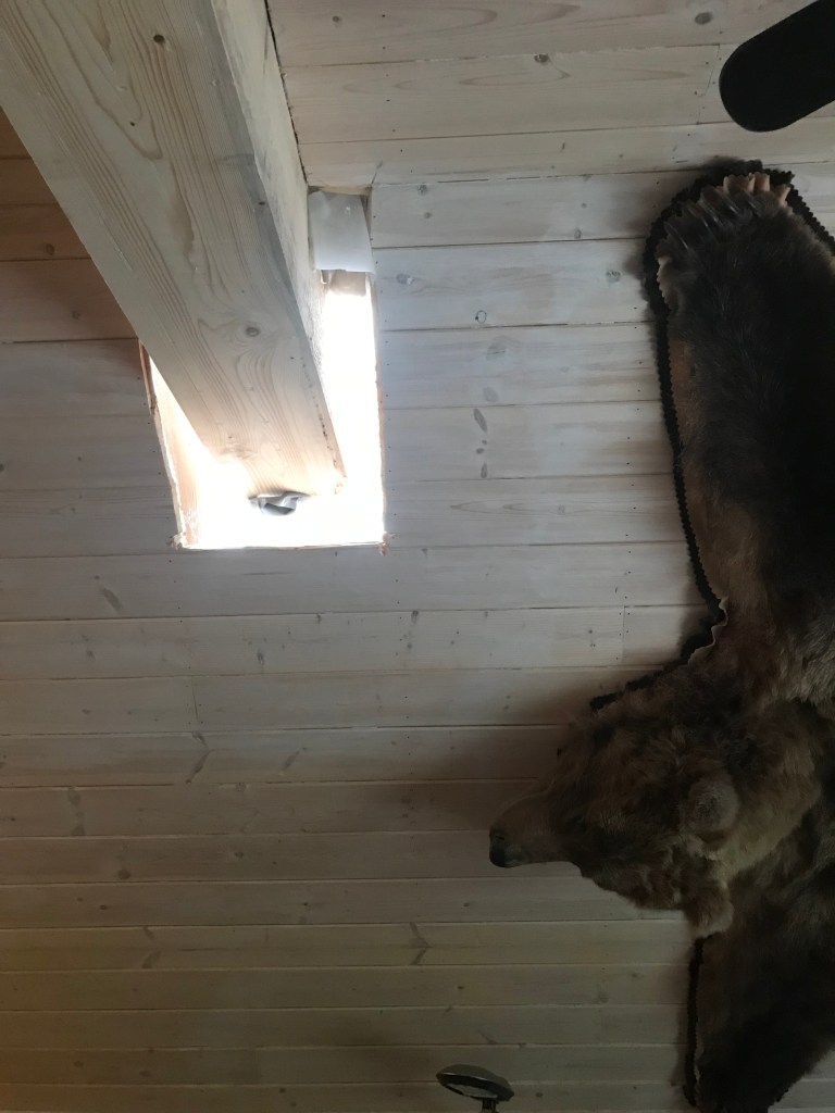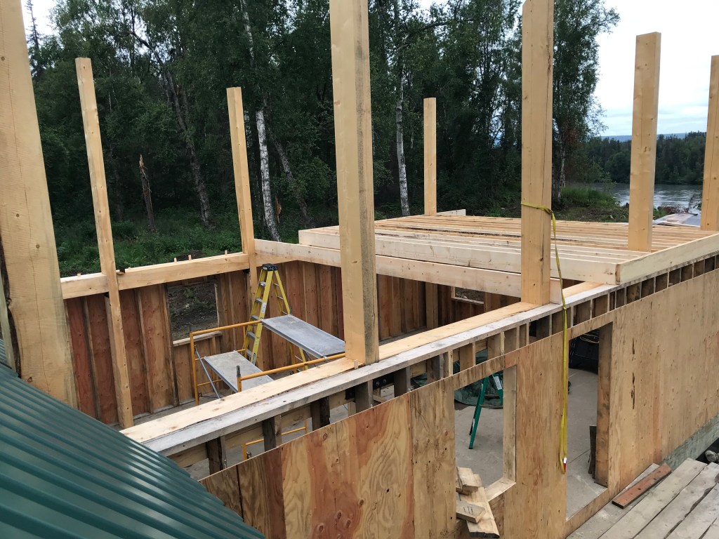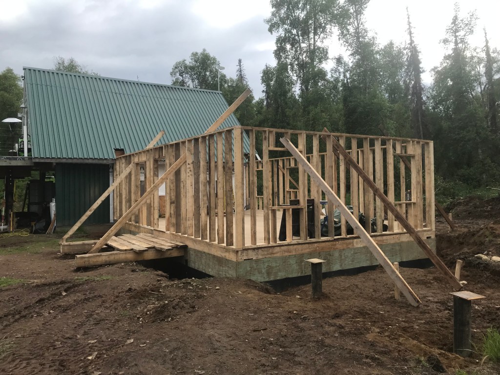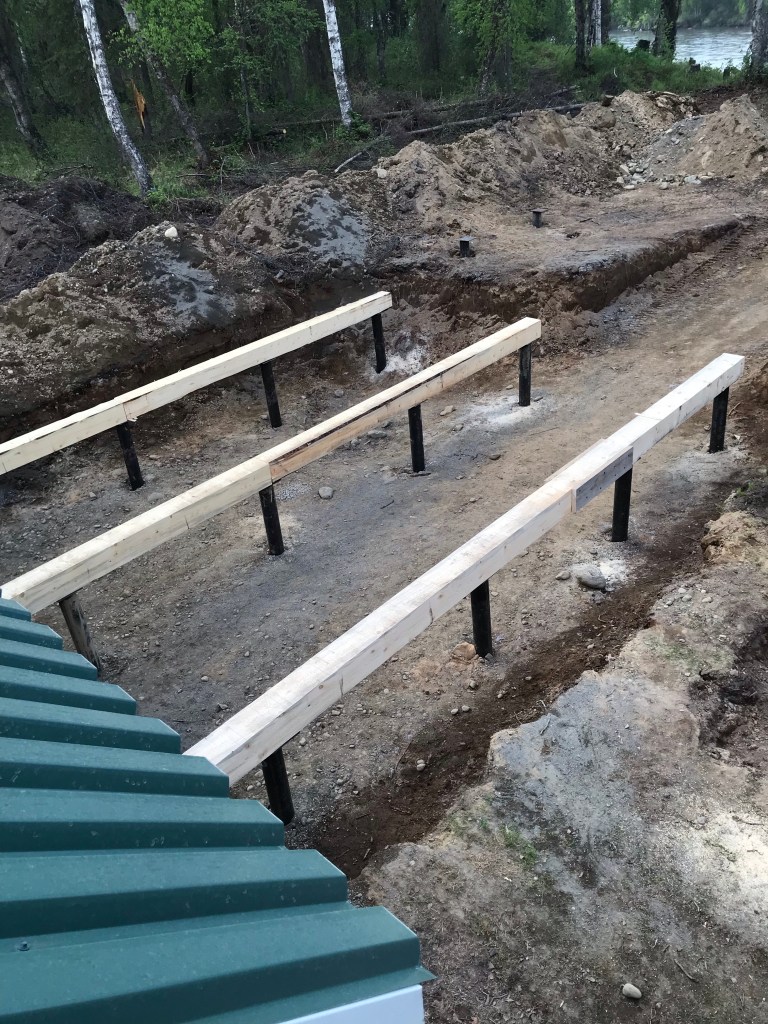 I think today was the day there were rumblings on the river telegraph aka FB that a barge is on the way upriver. I know you are thinking Mississippi River barges but our river barges are boats that are bigger than the Wine Down. Some are 30, 40 maybe even 50 feet long. They haul everything that is big and heavy that is needed up the river. Dozers, trucks, barrels of fuel, building packages for cabins, and in the case of the addition to Spruce Manor windows and a bathtub. As soon as our pilings are in and the river level cooperates a barge will haul the rig out. I tried to get the tractor out of the hole but I slept in too late and the mud was too soft. We need to get it out to do other things. The chief engineer said we need to lay boards down to get through the mud. I guess someone with a sawmill should have a lot of slabs laying around so that’s what we did. It walked right up the ramp. The chief engineer also cooks. Today she slow roasted a corned beef brisket glazed with mustard, honey, and brown sugar. We have boiled it before with cabbage and potatoes. Tonight’s dinner was awsome along with homemade potato salad and the bread she bakes in a big cast iron pan. If she keeps cooking like this I will need to redesign the addition with wider doors.