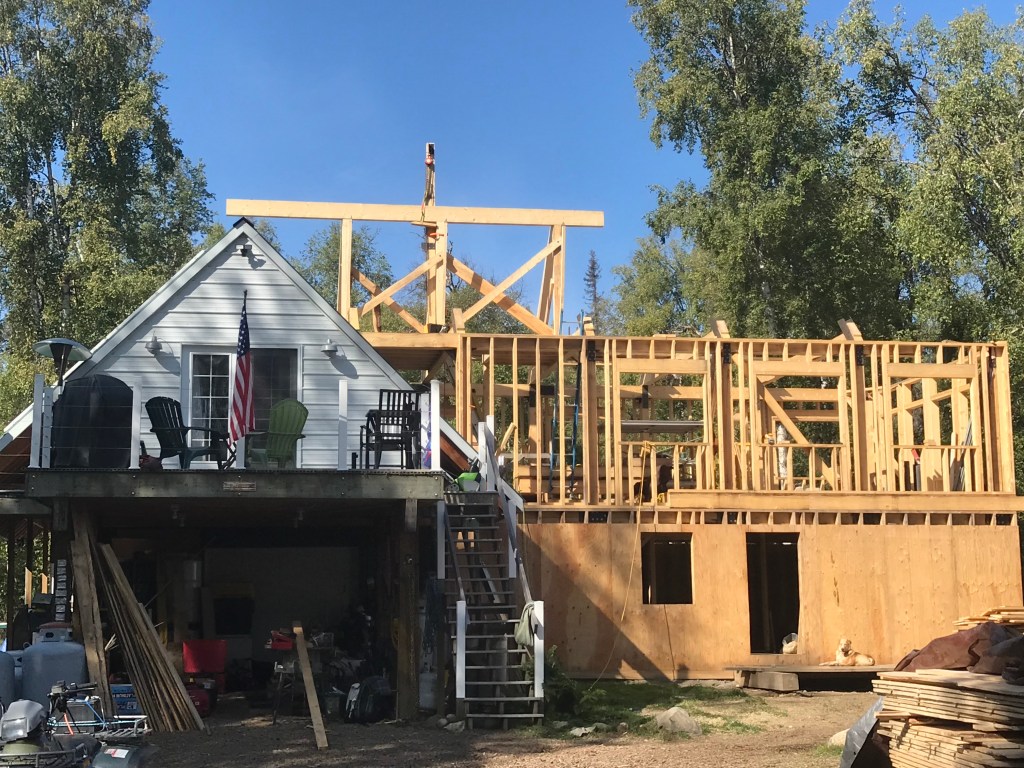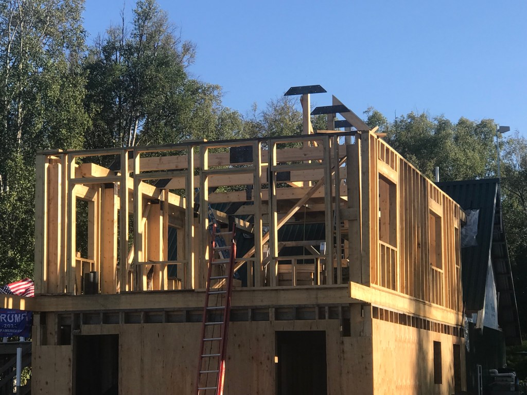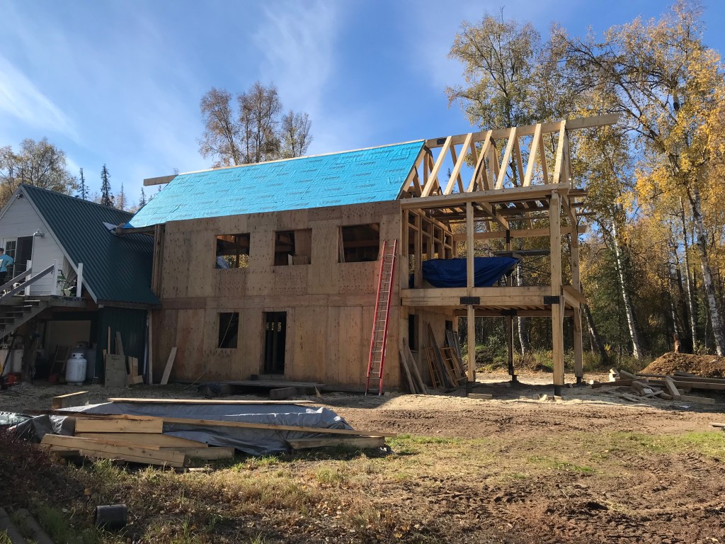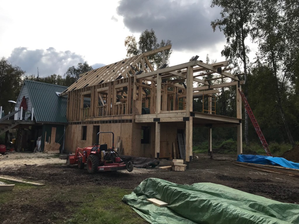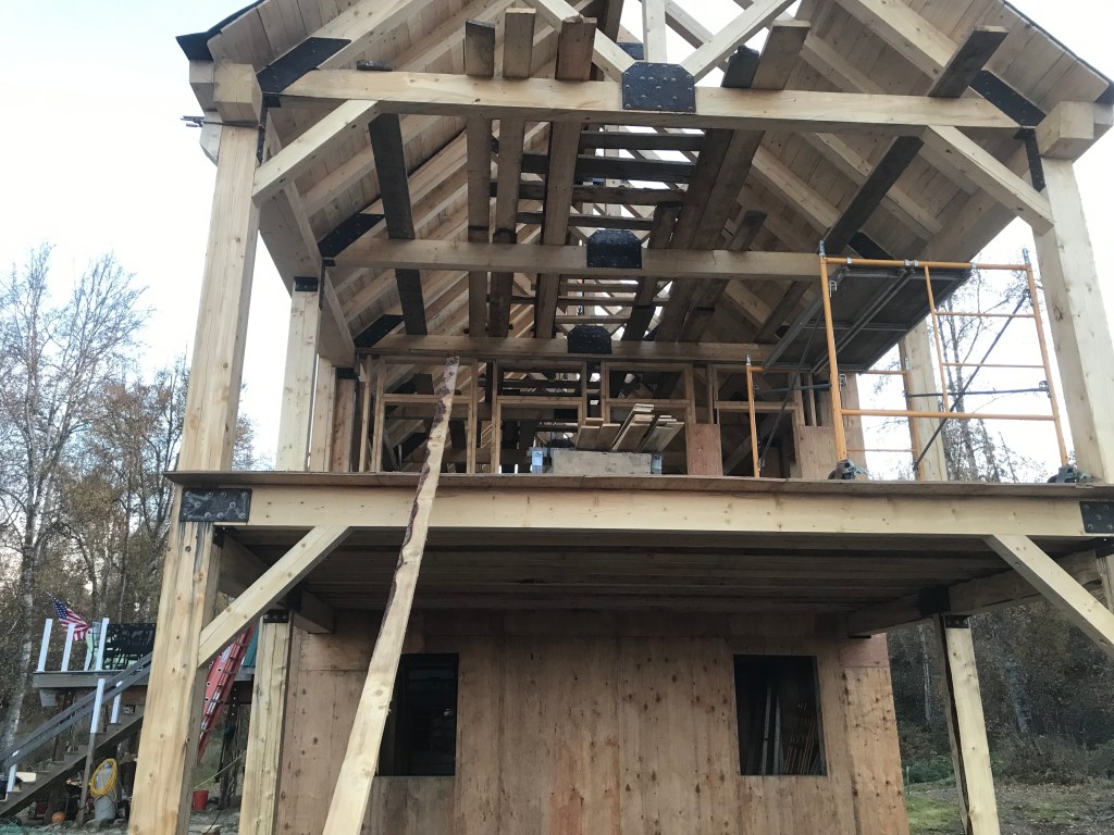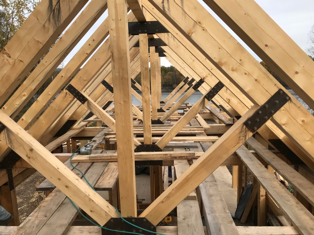 We put up another 3 foot row of wood and bolted 6 x 6s to 10 x 10 deck beams where there is no wall for the 2x 10 rafters to set on. I know all this trusses, 6×6 rafters, 2x 10 rafters, 1” ceiling is as clear as mud. Basically we built a frame out of heavy beams and then framed a house around it. The roof/ceiling will be foam insulated from the outside in the spring. Then the purlins and metal roof will go on at that time. The rest of the roof over the existing cabin will be tied together in the spring also. I hope you can get a better idea from the pictures. Any questions forward them to Mayor Cooper, he is the project engineer.