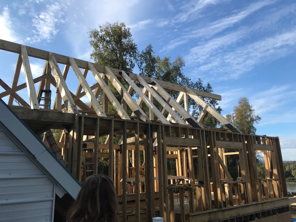 Rafters up on the east side. That’s all we can do until spring when we will tie into the main cabin roof.