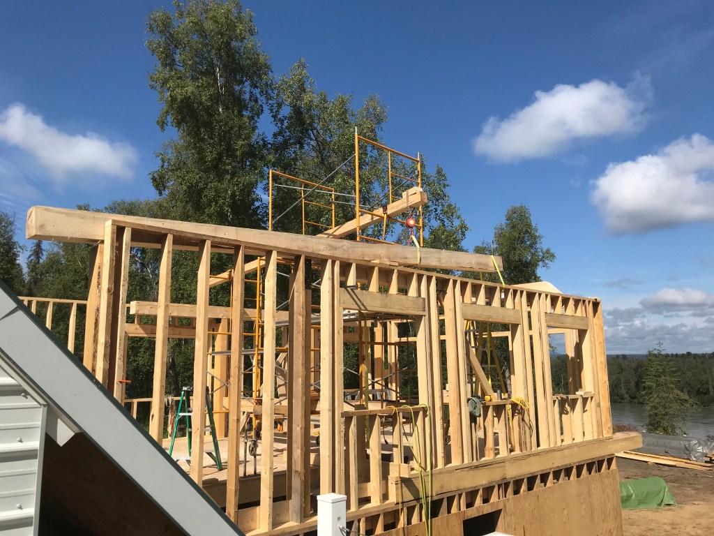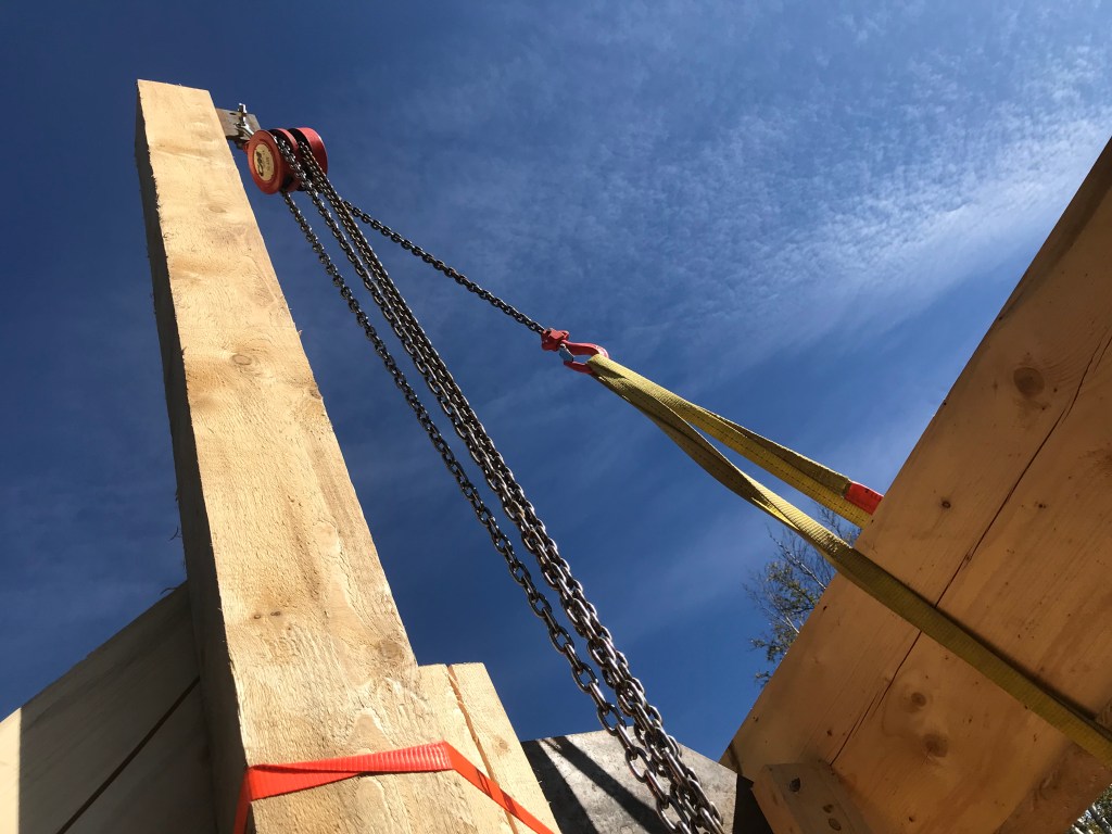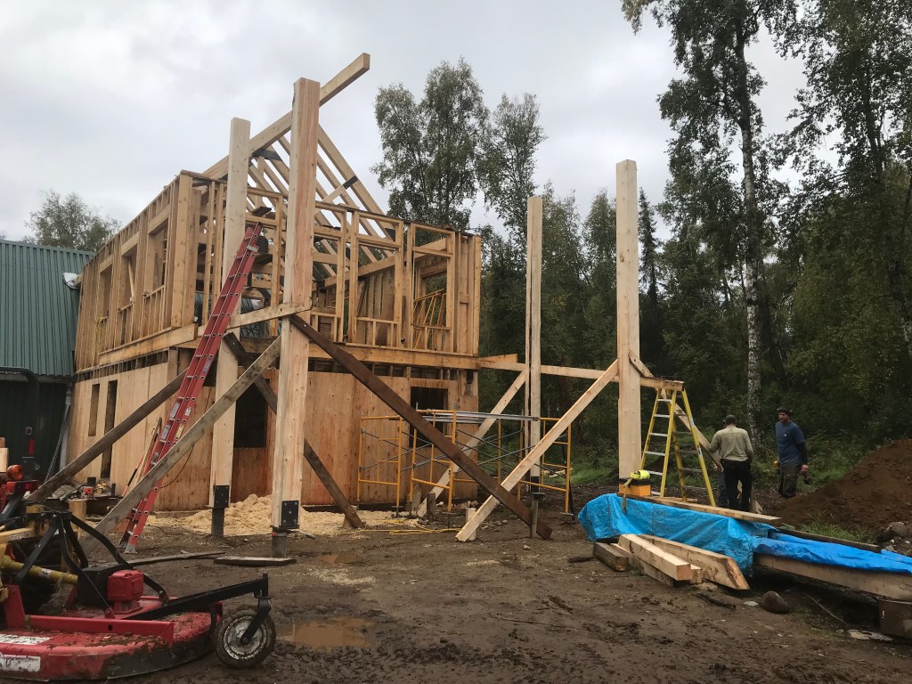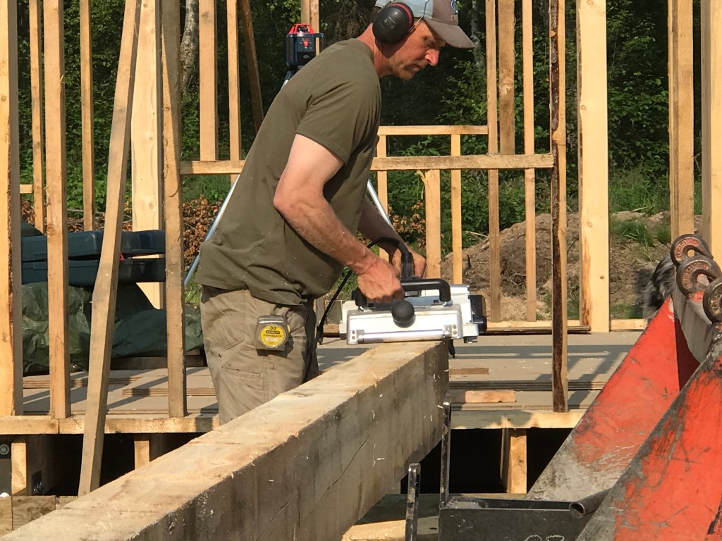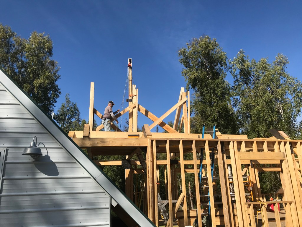 We have a full crew today. We completed the truss for the front wall of the cabin. Only two more trusses to build in place. We used the gin pole to lift the 6 x 12 for the ridge into place on top of the temporary posts. These posts will be replaced when we build the trusses.
