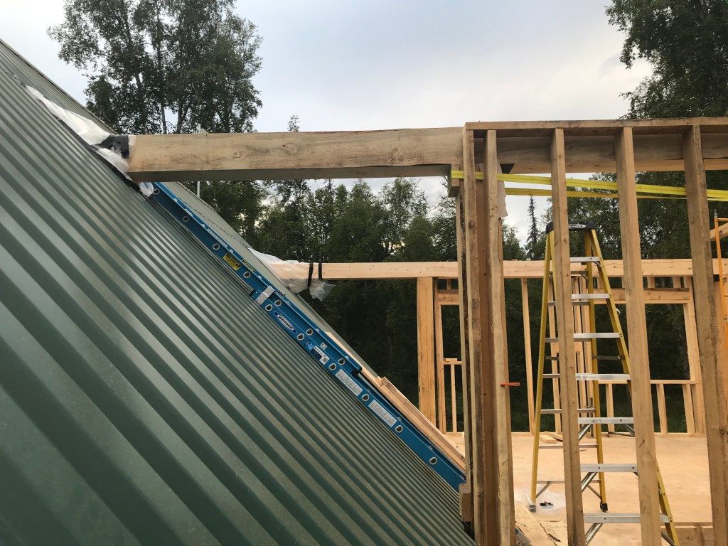I marked out the rafter spacing on the 2 x 12 ridge board and while Cory and Kari attached the brackets, I started checking the crown on the 2 x 10 rafters and cutting the 45 degree angle on the top end while Roger was putting the last strip of bituthane over the ridge. We will determine the length of the rafter and the location of the birds mouth after the ridge board is in place. The metal roofing is cut to length and here already so it is important to get the rafter length correct.