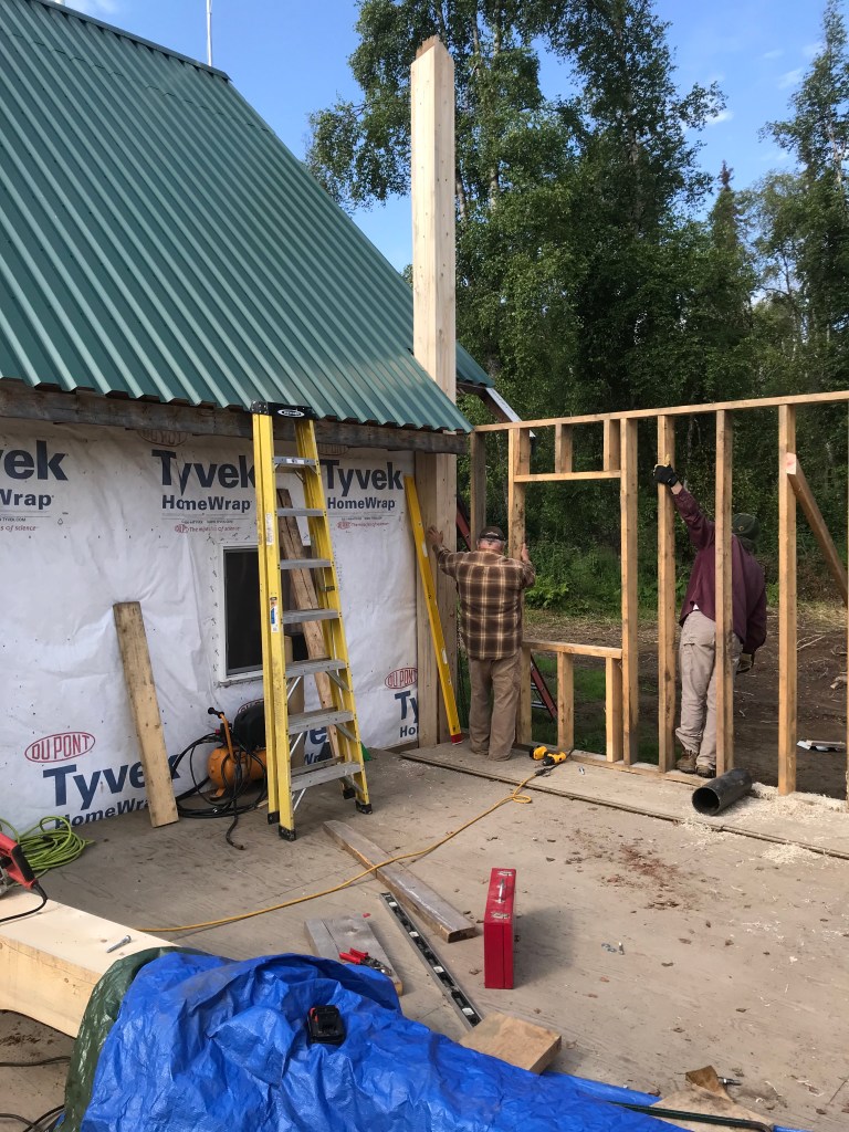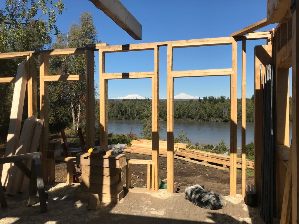 It is snowing today but it is warmer. Roger and Cory are going to the post office. My CPAP has a recall so I have been using a spare travel machine I have. My sleep doctor says it is better than nothing. I received an email that it could be a year before my recalled machine would be replaced so I ordered a new one from cpap.com to be shipped FedEx to Skwentna post office. Tracking says there are 2 boxes and the one with the machine is here. Roger and Cory can’t get to the po fast enough. They say without my machine I’m a grump. Well I don’t think so. Anyway I had a letter to go in the mail so I met them down on the island. They were leaving the dogs with me. So the 5 dogs and I are watching the boat depart. A few wanted to follow and I managed to call them back except for Rogers dog Mister. He was headed down the sandbar following the boat. I jumped on the 4 wheeler to chase him but he was already out of sight. I went about a half mile to the end of the sandbar and no Mister. I headed back to the cabin with the other dogs. Roger and Cory came back and they hadn’t seen him along the river. My Cpap box was only the supplies no machine. I guess I’ll be a grump until Monday when the mail plane comes again. Roger called the post office and Mister was there on the porch so he went back to pick him up. His paws are injured from the trip so he won’t be at work for a few days. Cory and I started the house wrap on the first story while Roger was gone. When Roger got back we put the windows in the lower level. It is raining and snowing now so we went inside. Cory stuffed insulation around the beams that are sticking through the ceiling because Kari is complaining about the cold air coming in. I guess we are weathered out. Might as well have a margarita.