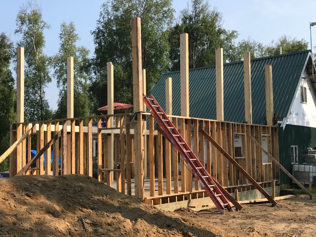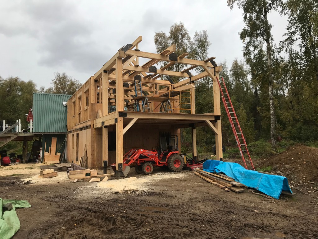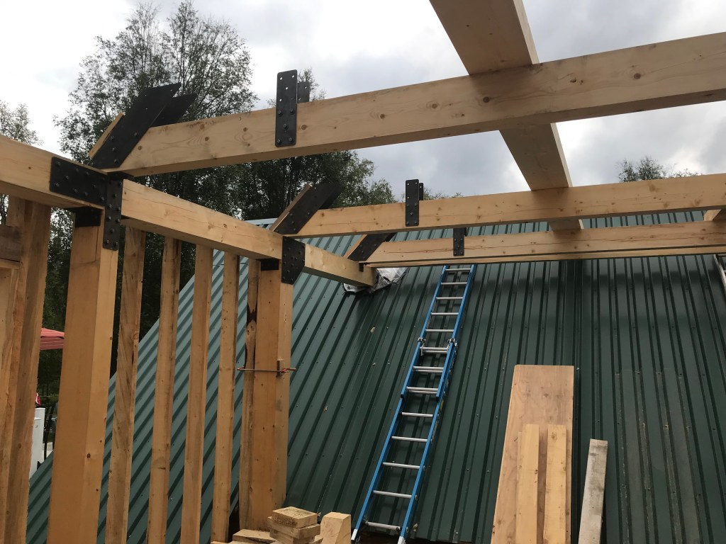 Roger, Dan and I made a platform to work from and set up our 2 temporary posts to hold the final ridge beam to go into place