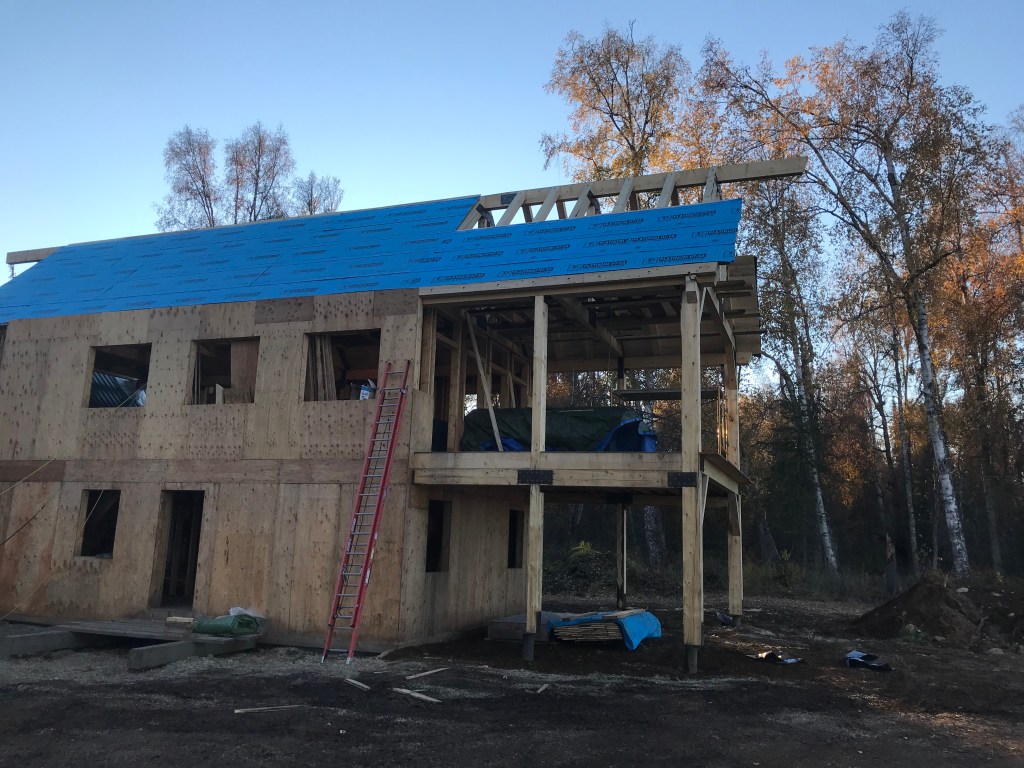 It is cold and windy again today and we were seeing a few snowflakes. And I don’t mean like the ones you see running around in town. We finished the wood and bituthane on to the peak on the east side and got two rows on the back side.