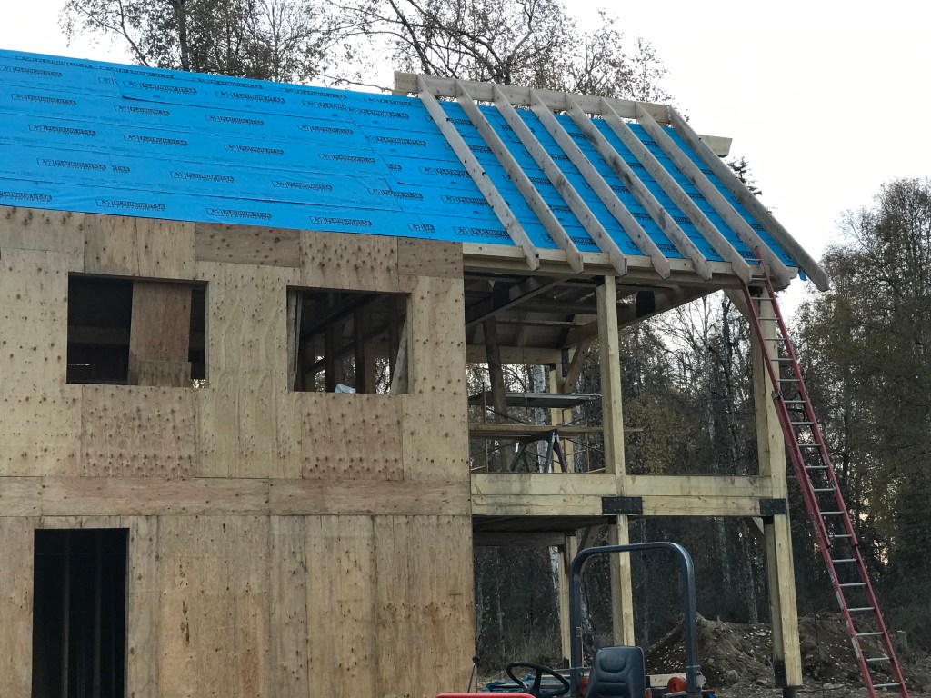 It is windy and cold today. We started putting the 1” lumber on the rafters 3 feet or so at a time then covering it with bituthane. Then another 3 foot row of